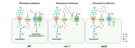 当野生型拟南芥即WT处于高NH4+/低NO3- 条件时,NH4+的大量吸收造成H+外排,导致根围酸化。此时NRT1.1介导NO3-/H+的同向内流,从而降低了胞外的H+浓度,抑制了根围酸化,缓解了铵毒症状。由于胞外的NO3-浓度较低,无法持续抑制根围酸化。因此,植物通过SLAH3来促进胞内NO3-的外排,使得NO3-在根围维持一定的浓度,以供NRT1.1介导NO3-/ H+的同向内流。最终,在NRT1.1-SLAH3复合物的协同作用下,引起了NO3-的高效跨膜循环,从而有效地抑制了根围酸化,缓解了铵毒症状。然而,在nrt1.1或slah3突变体中,NO3-的跨膜循环不复存在,导致根围持续酸化,从而加剧了植物的铵毒症状。