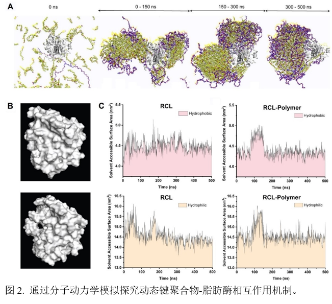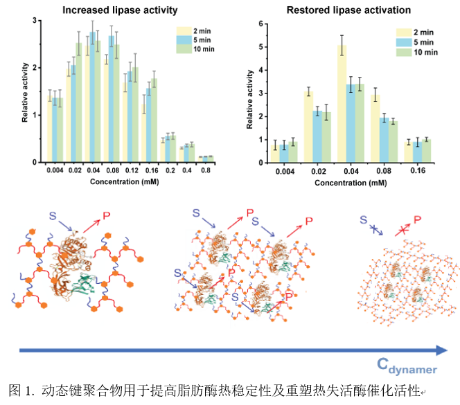 酶催化作为一种绿色高效的合成手段,在生物有机化学与生物技术领域占据核心地位。过去数十年间,研究者通过定向进化、酶固定化及化学修饰等策略持续优化酶的性能与稳定性,然而这些方法普遍存在筛选周期冗长或修饰流程复杂等局限性。因此,开发简便高效的酶活化与稳定化新方法具有重要科学价值。本研究以工业应用最广泛的脂肪酶为模型,创新性地提出通过向酶促反应体系中直接引入自适应动态键聚合物实现酶活化的新策略,并通过分子动力学模拟深入解析了其作用机制。(1)通过系统筛选两亲性动态聚合物,成功构建粒径分布为150-600 nm的脂肪酶包载型纳米催化复合体系;(2)该纳米复合物显著增强脂肪酶的催化活性,40 °C下的催化效能提高约3倍;(3)大幅提升脂肪酶的高温稳定性,60 °C下的催化活性提升10倍;(3)该纳米复合物还能恢复热失活脂肪酶的催化活性,复性效率为不添加聚合物时的5.8倍;(4)利用分子动力学模拟进行聚合物和酶的相互作用机理研究,表明动态键聚合物的存在促使脂肪酶发生构象变化,导致其活性中心暴露时间延长,提高了底物的可及性。