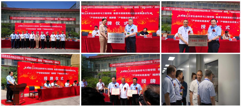 5月25日,兰州理工大学生命科学与工程学院“产学研实践基地”揭牌仪式在临夏市清源清真肉制品有限责任公司隆重举行。省科技厅科技人才与科普处处长吕戈,临夏州科技局党组书记、局长马海俊出席;科技厅科技人才与科普处副处长周磊、四级调研员潘益刚,临夏市科技局局长马文波,清源公司董事长绽学忠、副总经理马国强,生命科学与工程学院院长伍国强教授、李志忠教授、王永刚教授、余长俊博士,州科技局及清源公司部分员工参会。仪式由州科技局党组成员、副局长田学龙主持。