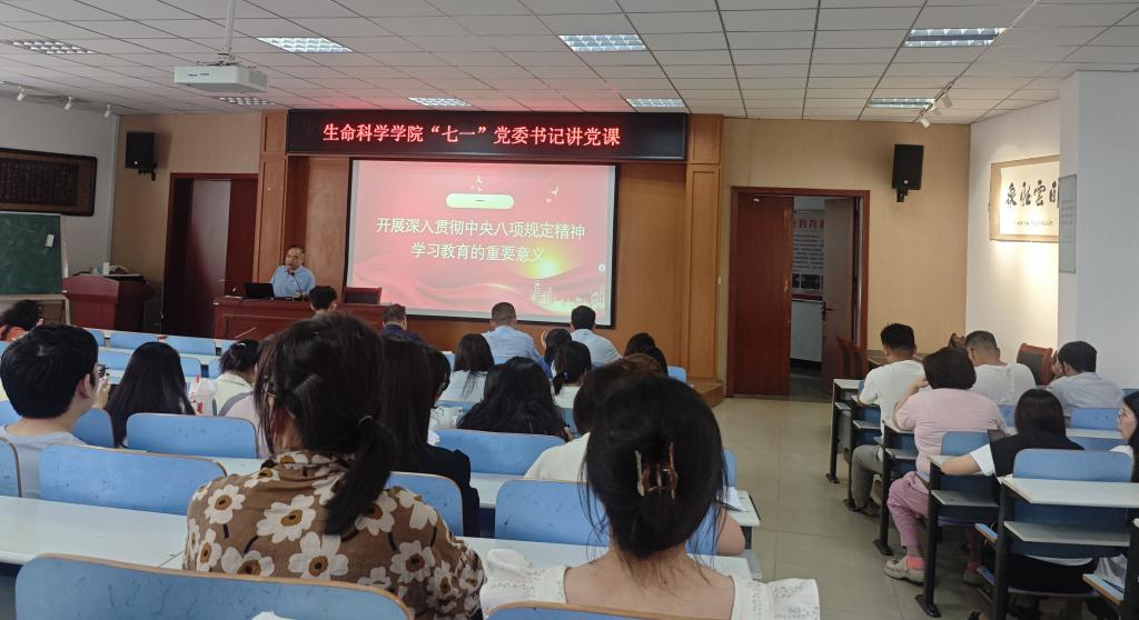 6月27日下午,生命科学学院党委组织召开全院师生党员大会,深入贯彻中央八项规定精神学习教育。党委书记李刚以《深入贯彻中央八项规定精神学习教育--筑牢抵制违规吃喝防线,敲响清正廉洁警钟》为题,讲授专题党课。